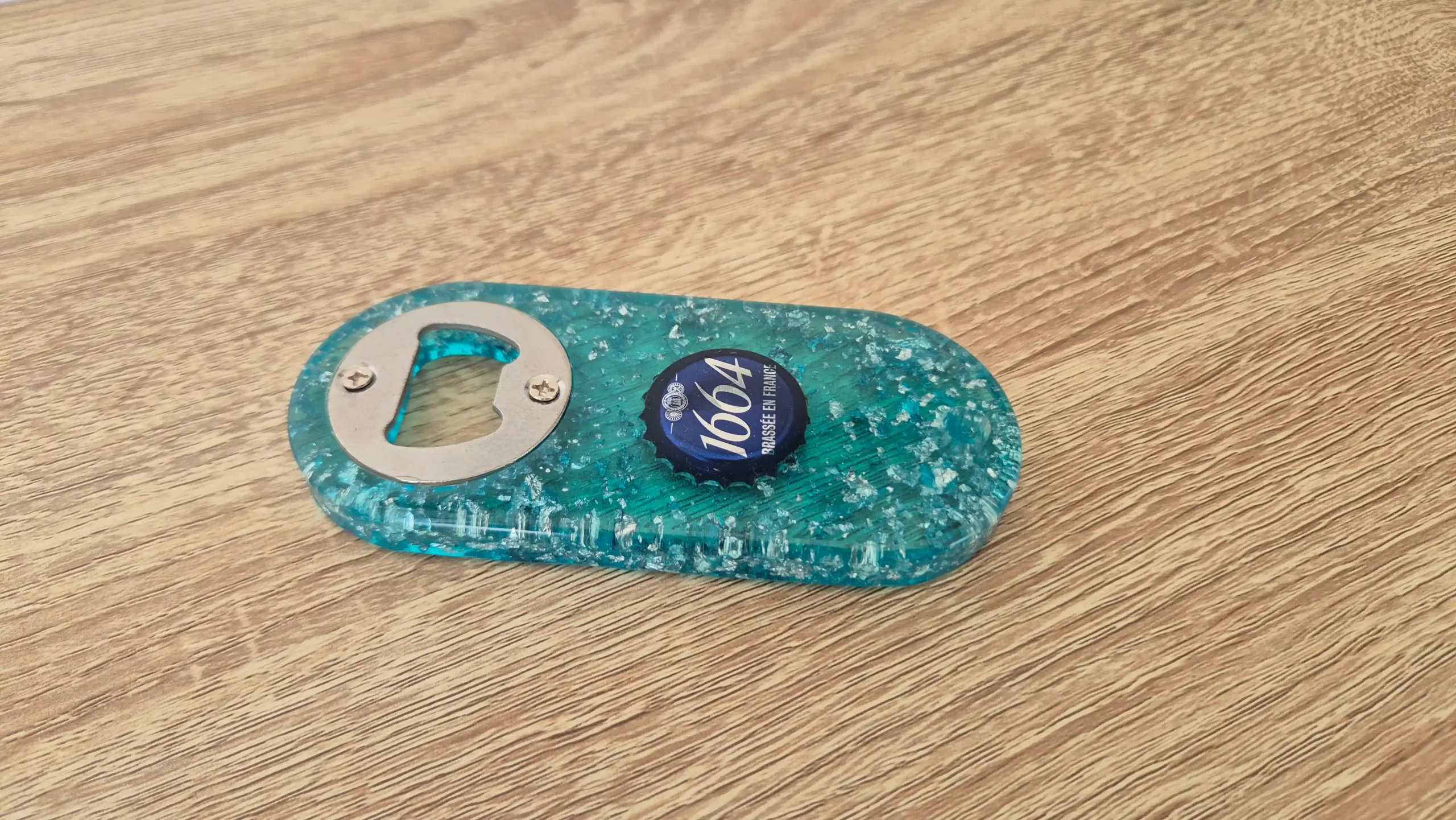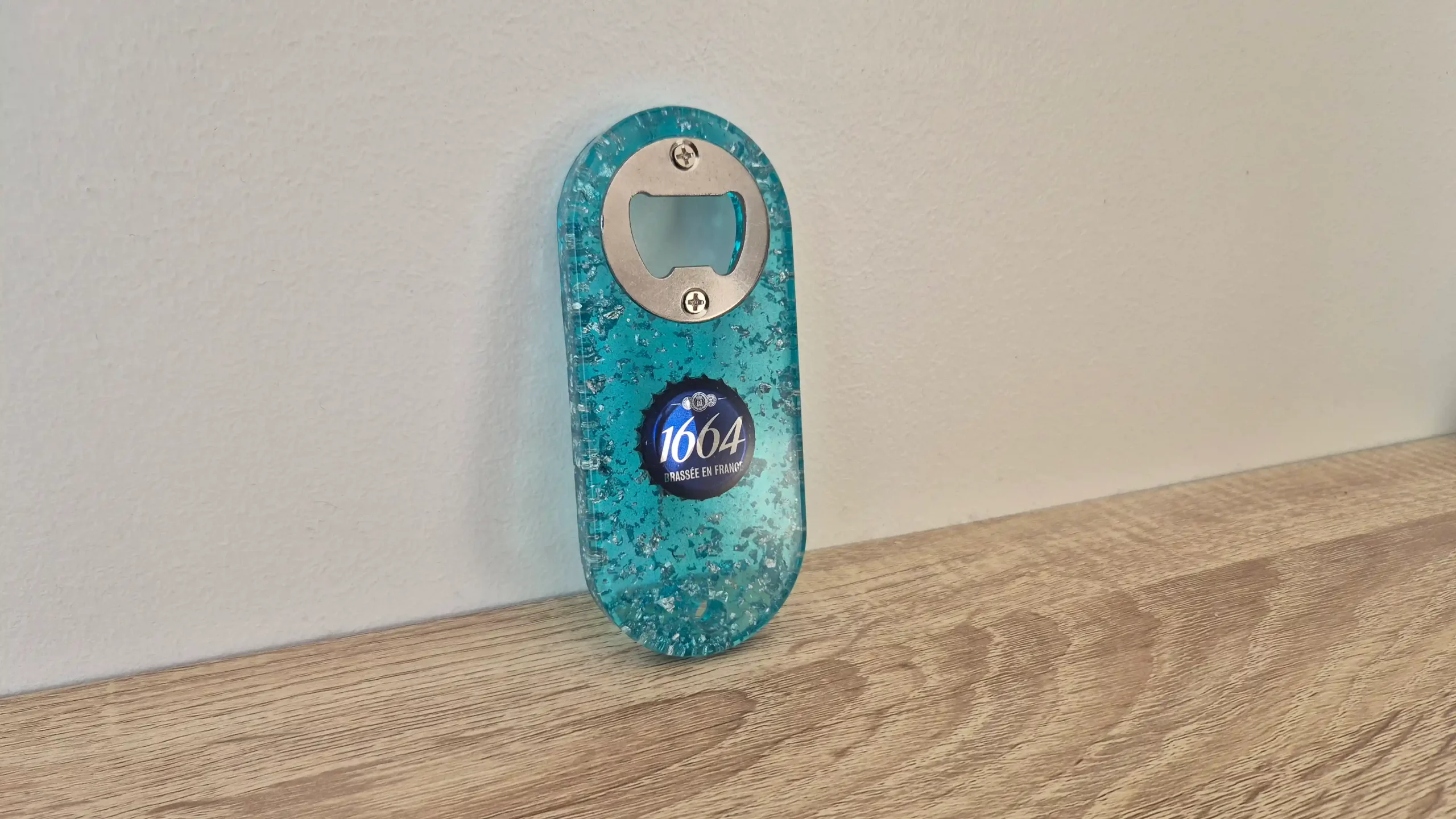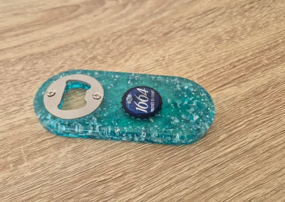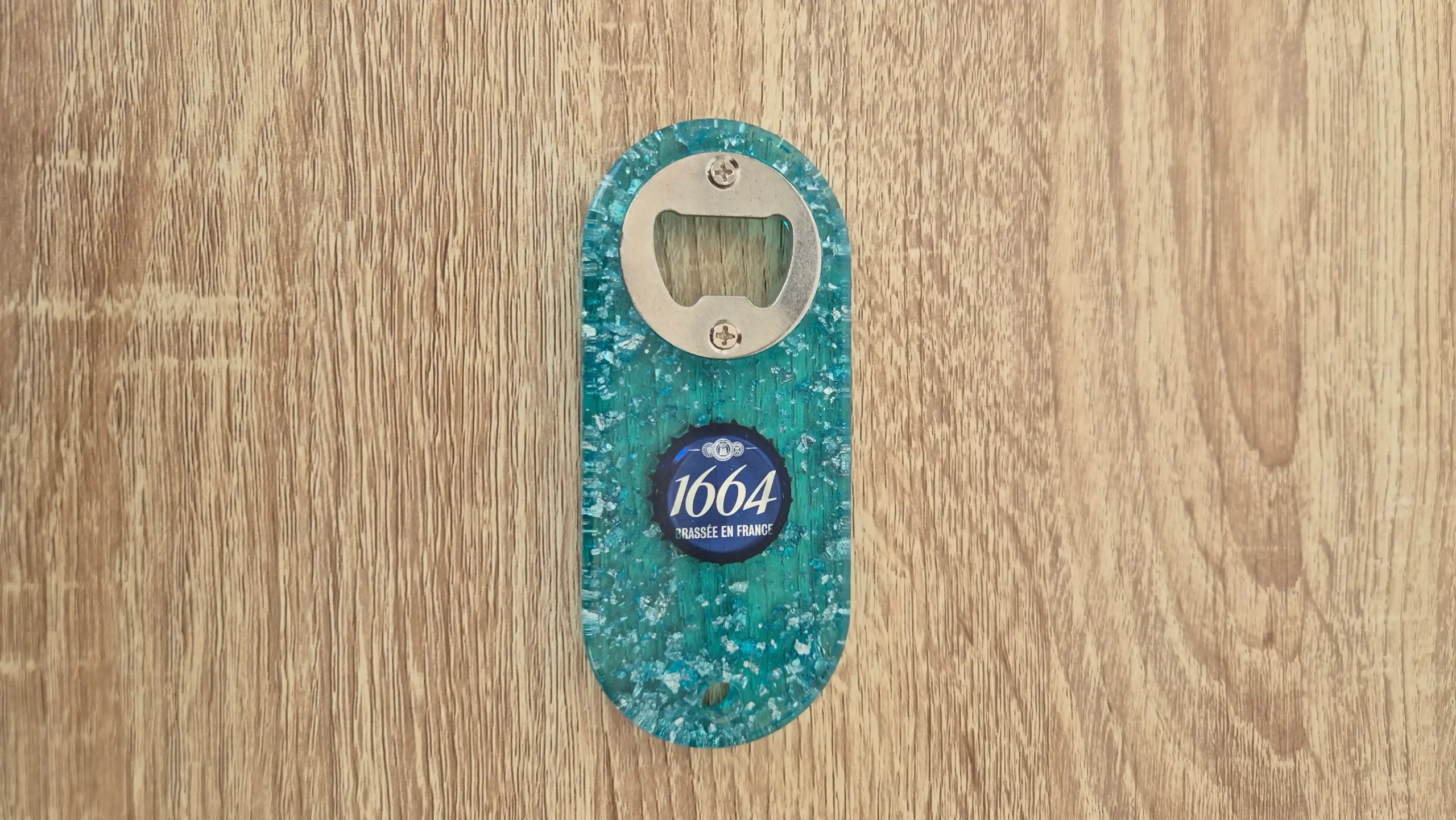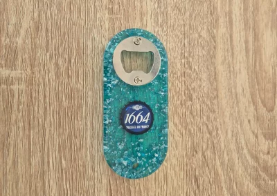 Accueil / Accessoires pour la maison / Décapsuleurs / Décapsuleur bleu feuille d’or argenté 1664