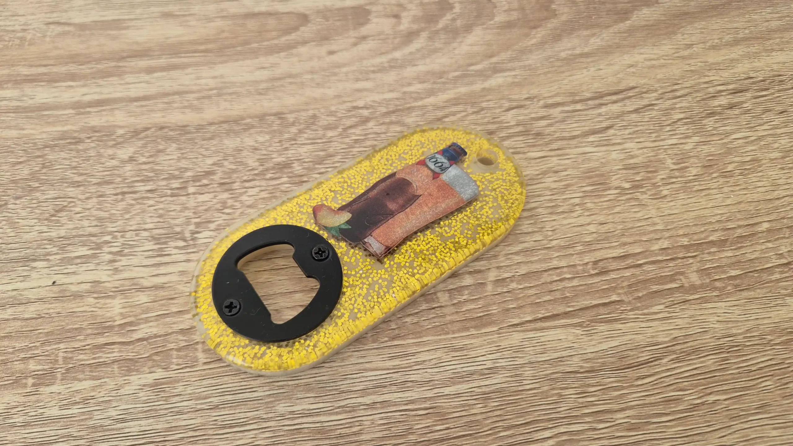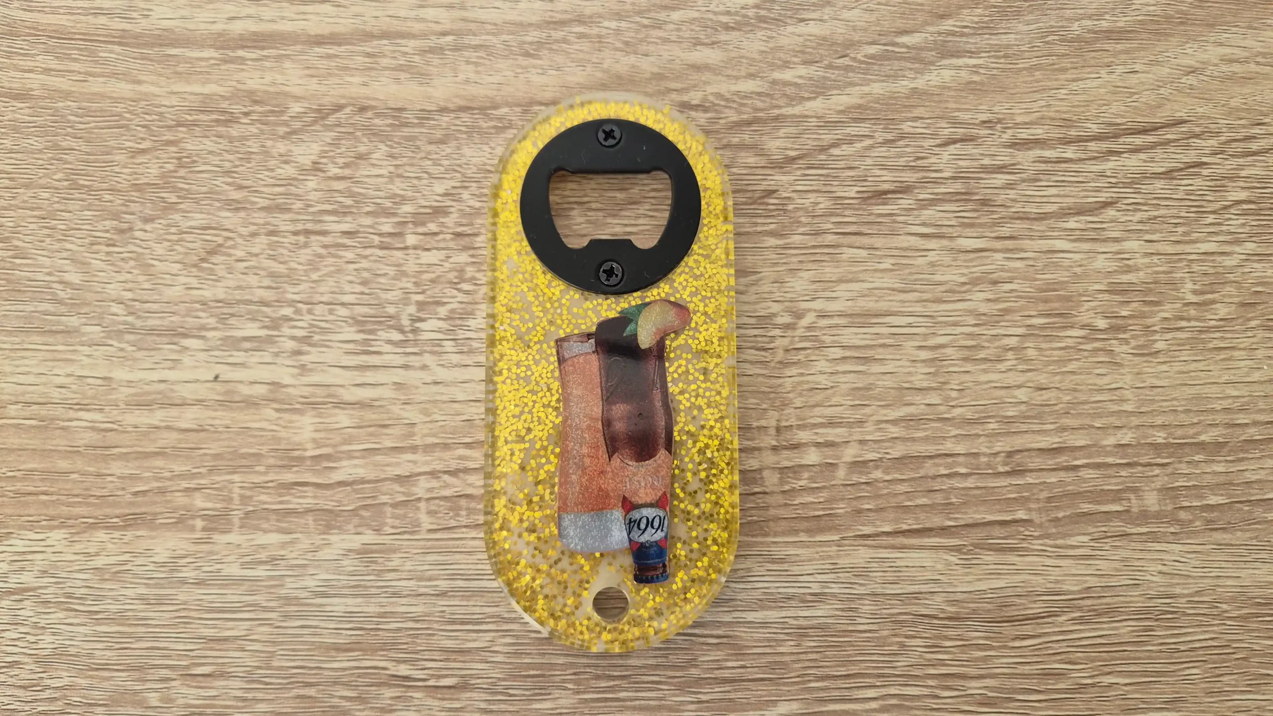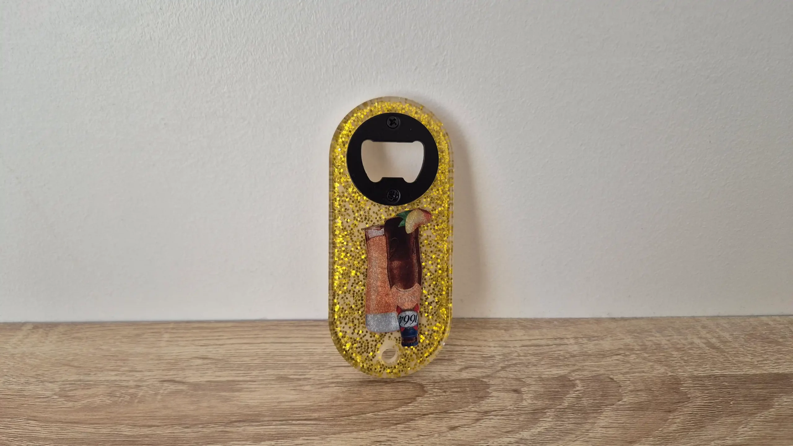 Accueil / Accessoires pour la maison / Décapsuleurs / Décapsuleur paillettes dorées 1664 pêche