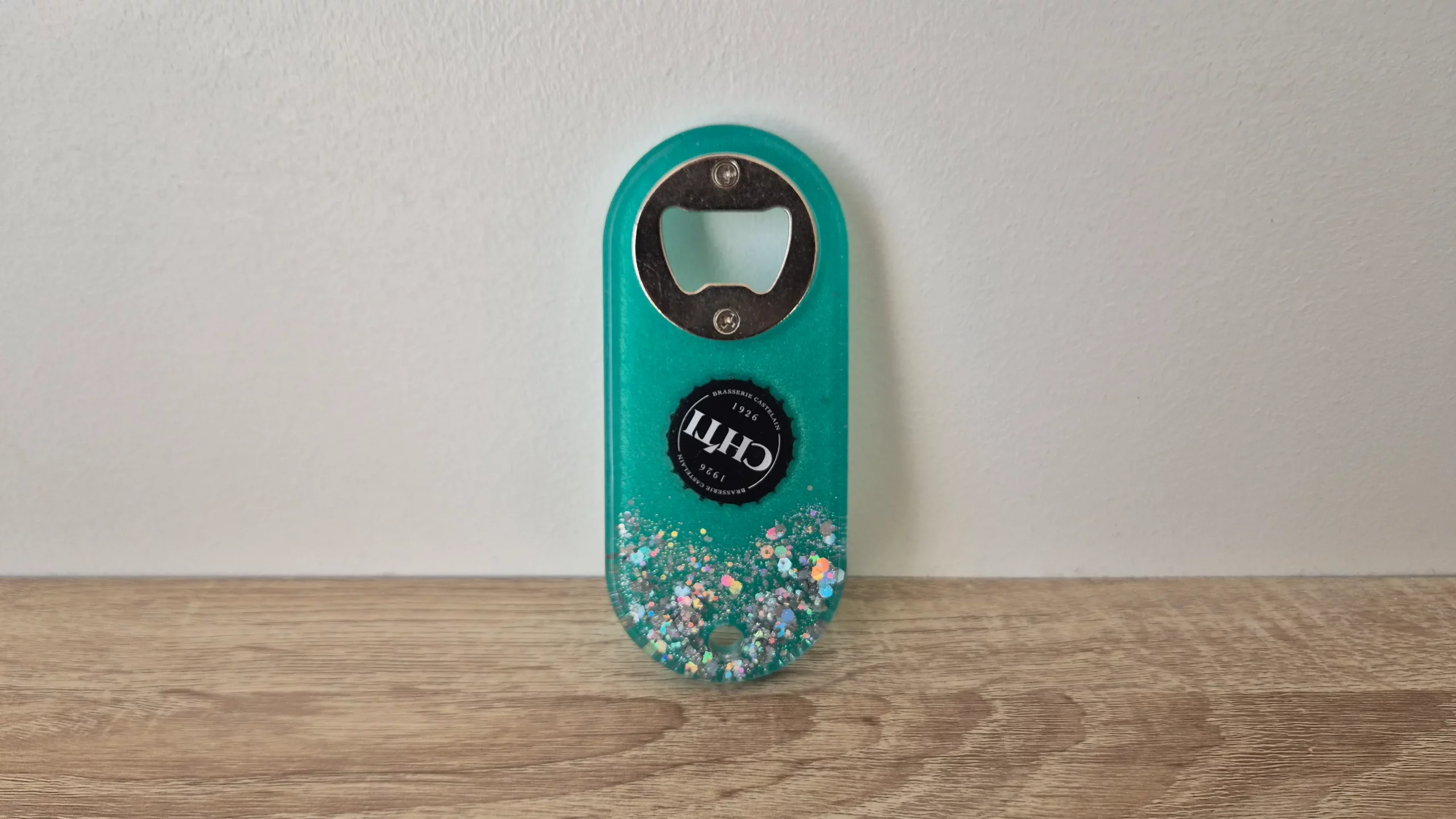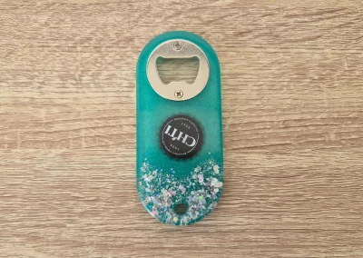 Accueil / Accessoires pour la maison / Décapsuleurs / Décapsuleur vert d’eau et paillettes Chti