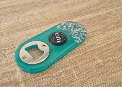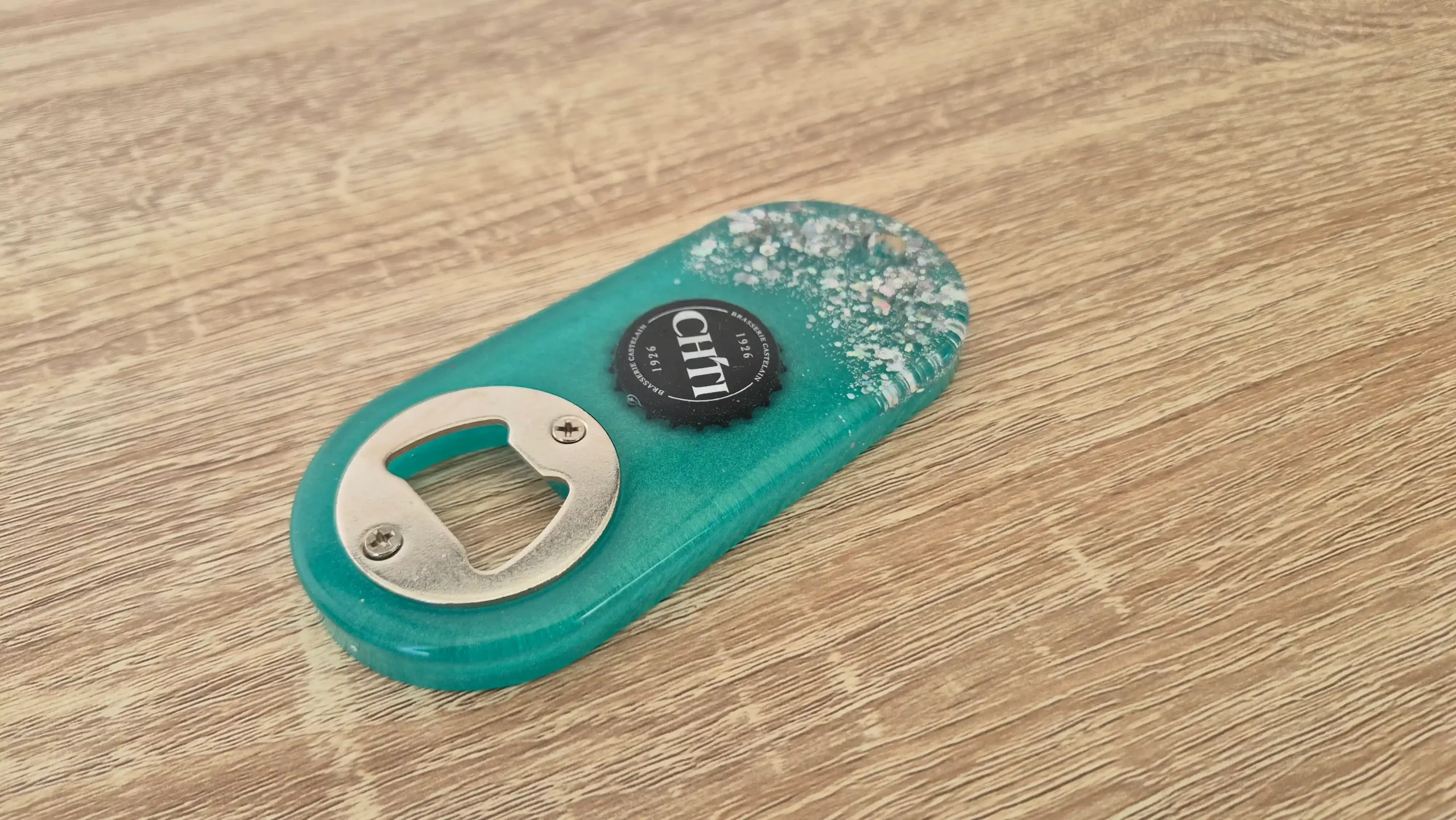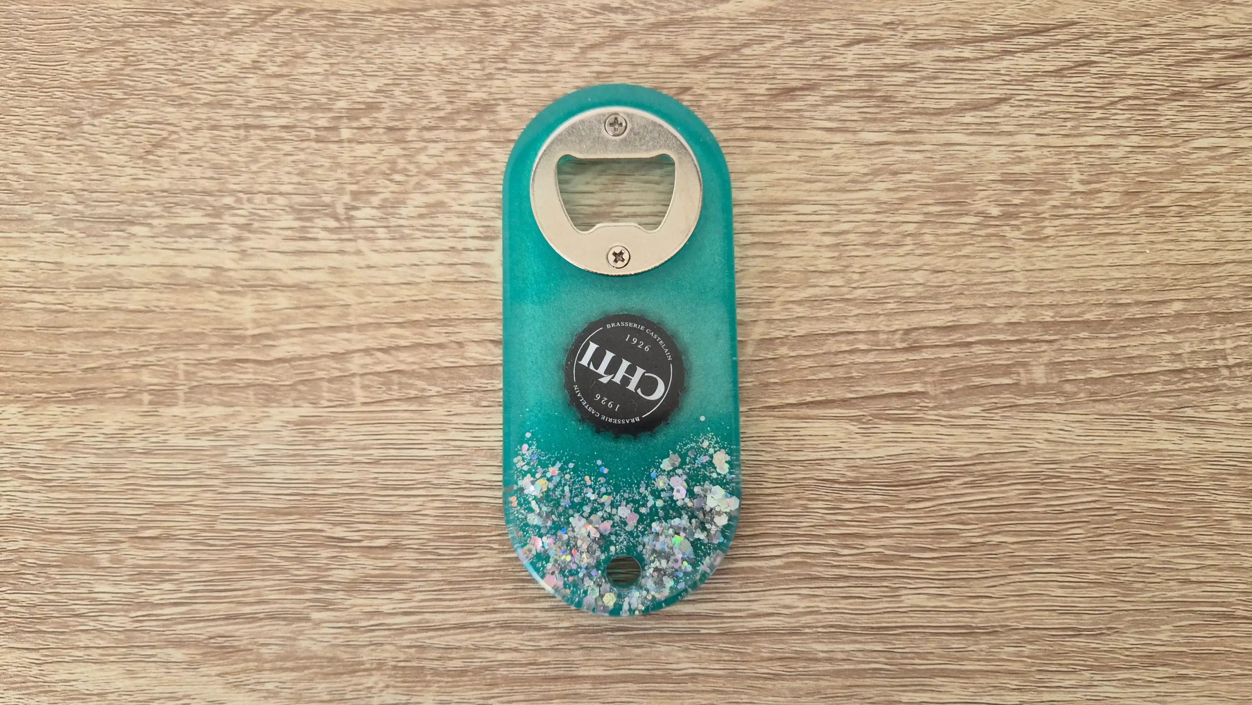 Décapsuleur vert d’eau et paillettes Chti