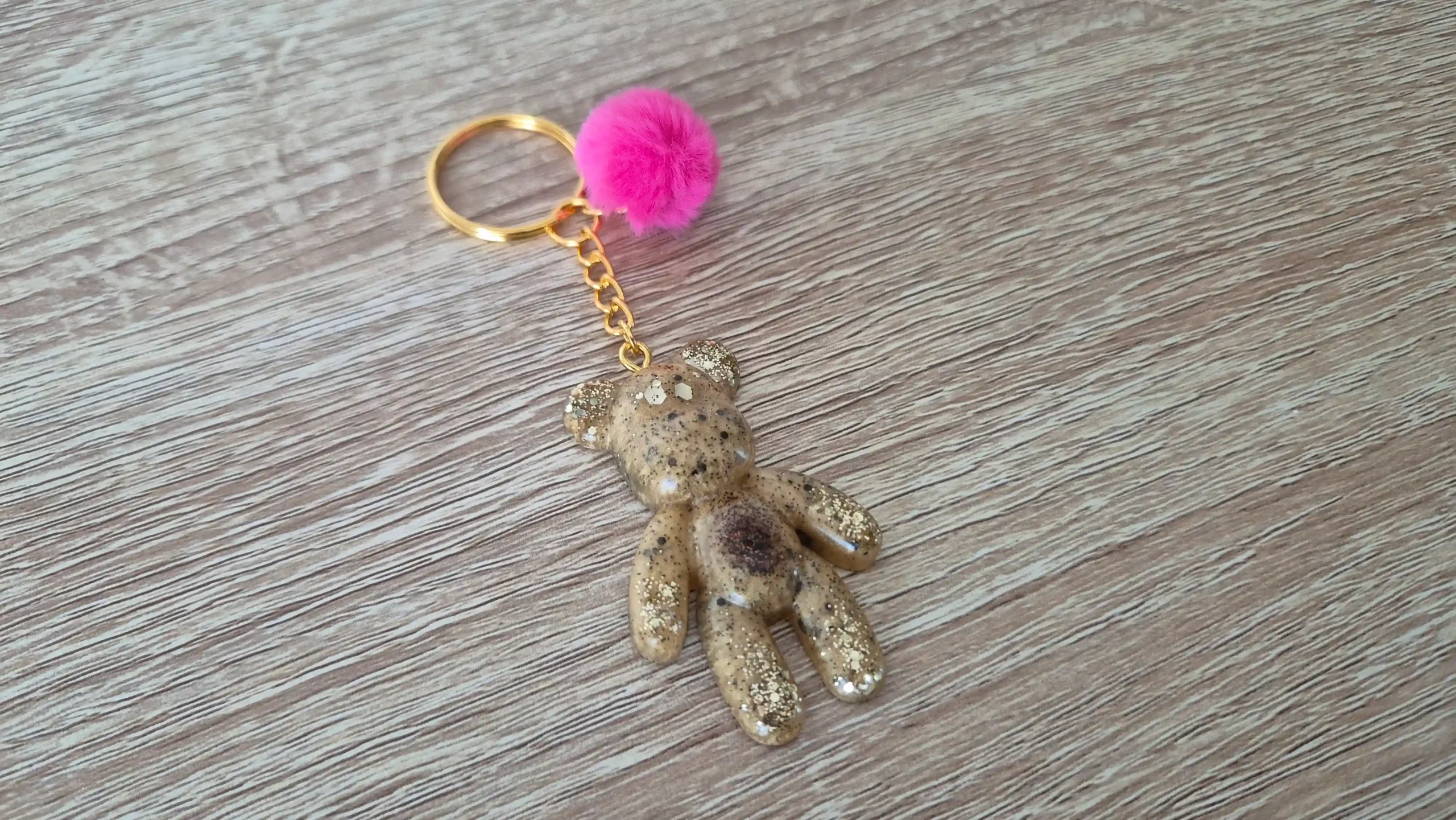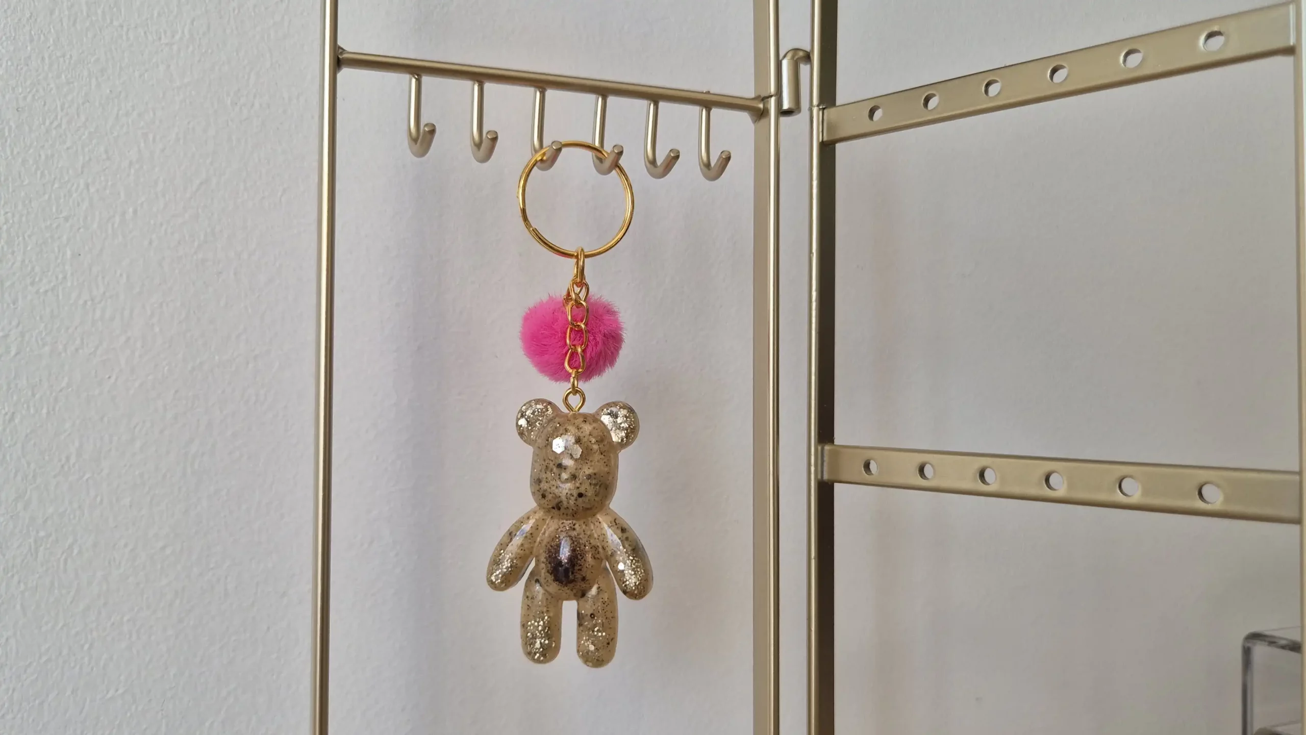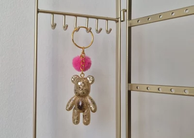 Accueil / Bijoux et accessoires / Porte-clés / Porte-clés ourson doré avec pompon rose